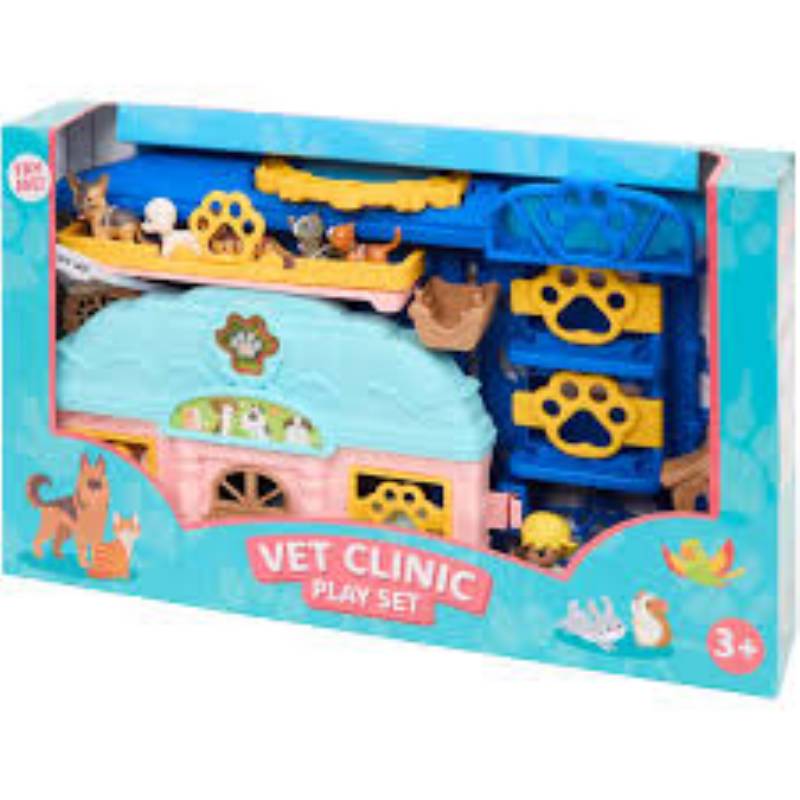 1 clinique vétérinaire articulée 1 poignée jaune 1 enseigne jaune 3 portes jaunes 1 porte brunne 2 fenêtres jaunes 1 panier ascenseur brun 1 panier brun (3/4) 1 lavabo avec robinet 1 roue pour amster 1 toise brunne 1 balance blanche 1 ordinateur avec 1 radio 1 cache piles 1 cage à oiseaux 1 table avec 1 lampe 2 personnages 3 chiens 2 chats 3 hamsters 2 lapins 1 perroquet 8 accessoires blancs (voir image) 1 fourre avec instructions et détails 1 filet 2 sachets plastique |